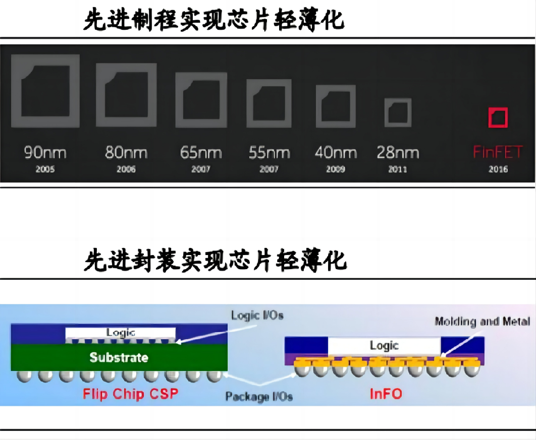 在芯片輕薄化方面,在不犧牲芯片整體性能的前提下,先進制程能夠在算力和晶體管數目不變時,通過縮小單個晶體管特征尺寸,實現芯片面積(Die size)縮小;而先進封裝,因為封裝對晶體管尺寸無微縮的能力,只能通過更精細的材料、更致密的結構來實現輕薄化。比如,手機AP處理器的封裝多采用FCCSP的封裝形式,其結構包括一個CSP載板,而Fanout(TSMC與APPLE公司合作,APPLE公司的A系列芯片多采用InFO技術封裝,即Fannout)封裝,取消了CSP載板(CSP載板約0.3 mm厚度),封裝后的芯片更輕薄,對整機(手機)結構空間余量有重要提升。