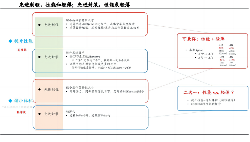 在高性能和輕薄化兩個方向上,先進制程可以做到兼顧,而先進封裝則有取舍。比如,APPLE的A系列芯片,從A10升級到A11時,由16 nm工藝提升至10 nm工藝,芯片面積從125 mm2減小至88 mm2,而晶體管集成數則由33億顆增加至43億顆;A系列芯片從A13升級到A14時,晶圓工藝從7nm升級到5nm,芯片面積從98 mm2減小至88 mm2,而晶體管集成數則由85億顆增加至118億顆,做到了性能提升和輕薄化的兼顧。而先進封裝,要做到芯片性能提升,因為封裝對晶體管尺寸微縮沒有效果,提升性能一是增加芯片內部各元件的協作效率,二是往一個系統中堆疊更多的元件(本質上也是提升了系統內的晶體管數據),代價就是系統體積、面積更為龐大,即先進封裝提升性能的代價是犧牲輕薄,實現輕薄的代價是犧牲性能的提升。