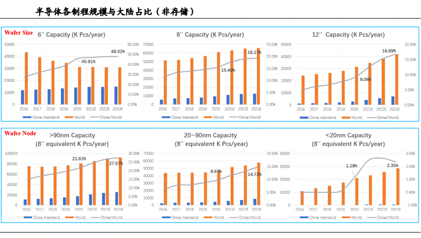按不同晶圓尺寸統計,大陸6英寸晶圓產能已占全球近一半,而12英寸產能僅為全球約10%。按不同制程統計,大陸90 nm以上制程占全球約20%,20-90 nm制程占全球約10%,20 nm以下制程僅占全球約1%。大陸高端制程占比低,產業結構存在明顯短板,未來擴產空間大。高端制程擴產投入大,3 nm制程芯片每萬片產能的投資約100億美元,遠高于28 nm制程芯片每萬片約7億美元的投資。彌補大陸晶圓產業結構短板,需重點投資高端制程晶圓制造產能,既需要完成技術攻關,又需要大額投資支持,任重而道遠。